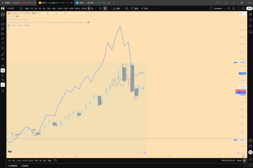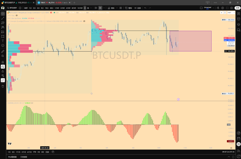 从大周期来看,BTC自四月起涨,于七月份进入横盘阶段。目前已两次测试自起涨以来的主要成交密集区(约104K一线)。随着市场动能的持续积聚,价格正尝试从104K区域向上突破118K关口。若能放量突破,将确认新一轮上升趋势的启动。