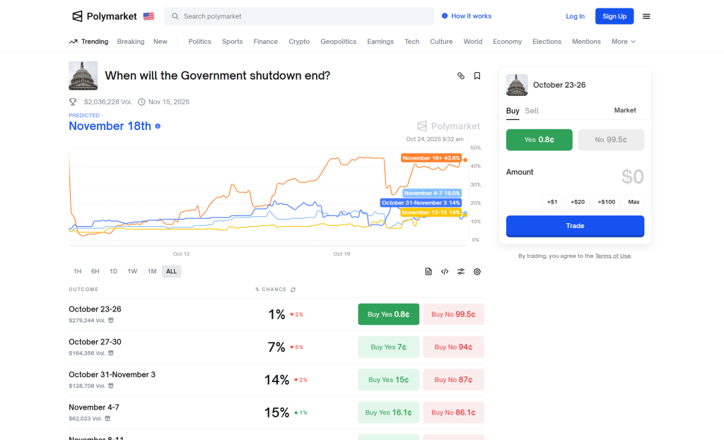 目前PolyMarket预测停摆持续至11月16日的概率超过43.6%。