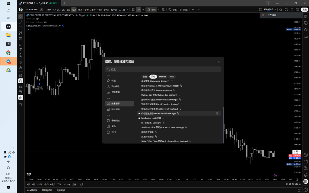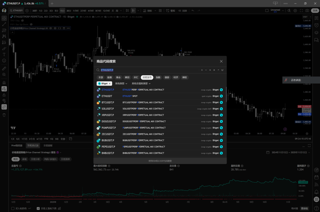 第一步大家要先确定想要使用的策略,我们这次就用价格通道策略,将价格通道策略添加到图表中,就可以通过回测看到该策略的过往的表现数据,同时大家在选择交易标的时要选择和你交易所的交易标的,比如筛选Bitget交易所的交易标的USDT.P就是合约。