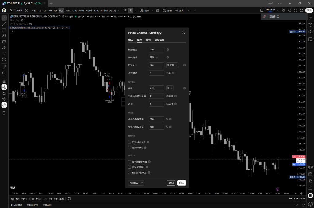 第二步大家需要设置一下策略的属性,以便回测的数据更加精准。例如添加你的初始资金,和平台交易手续费(Bitget为0.06%,OKX为0.05%),当然大家也可以去找返佣嘛。还有要把订单大小改为100%,每次下单都是全仓all in,大家也可以根据自己的情况去修改。