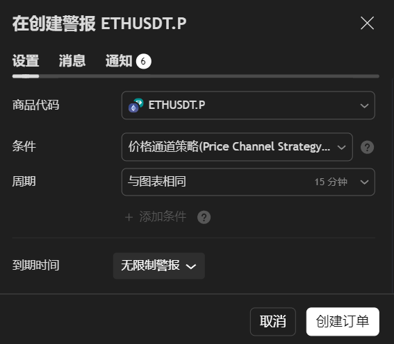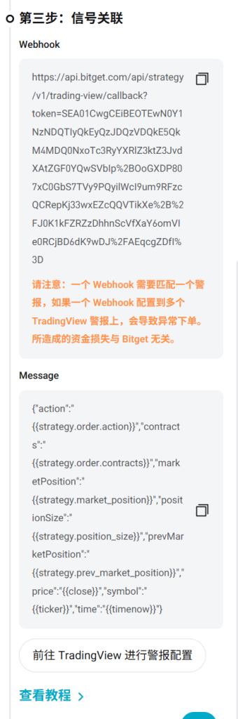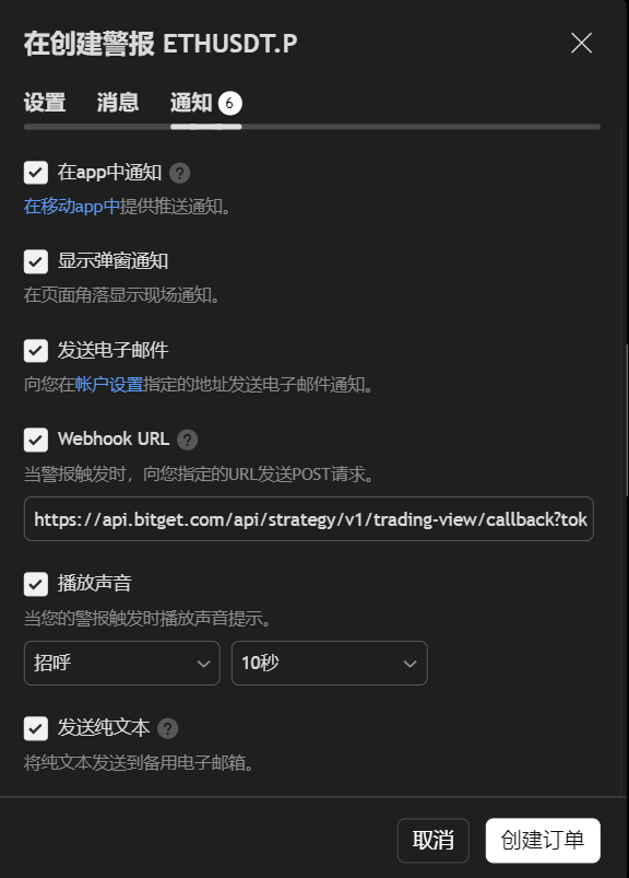 在这个界面我们会看到我们的信号关联的信息,复制Webhook的链接,打开TradingView的警报功能在通知中打开WebhookURL,将链接粘贴就可以了。
