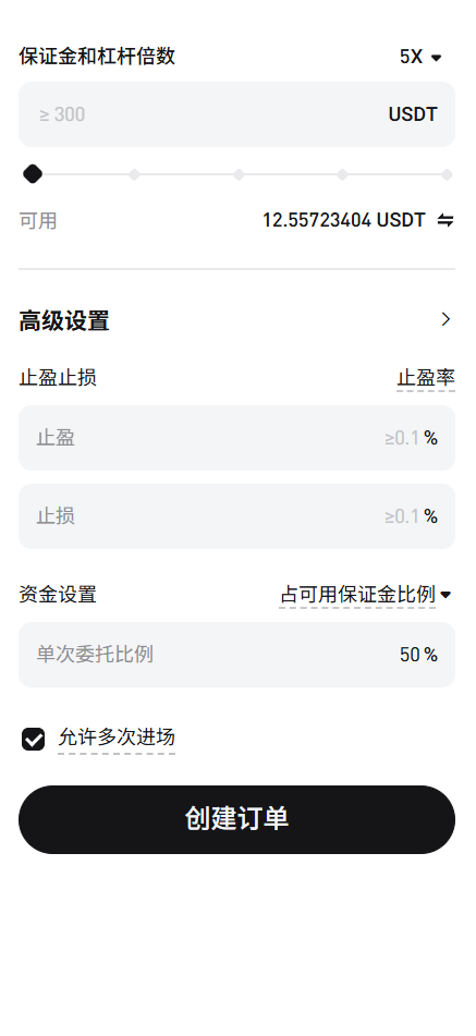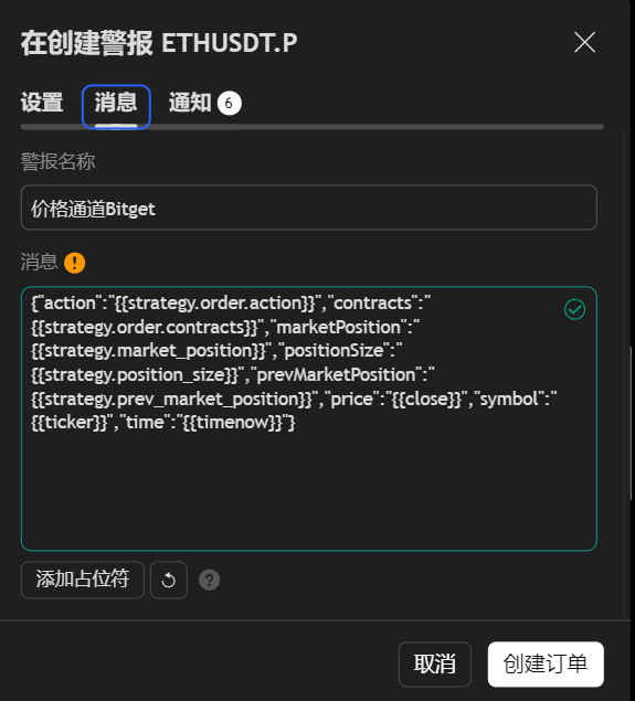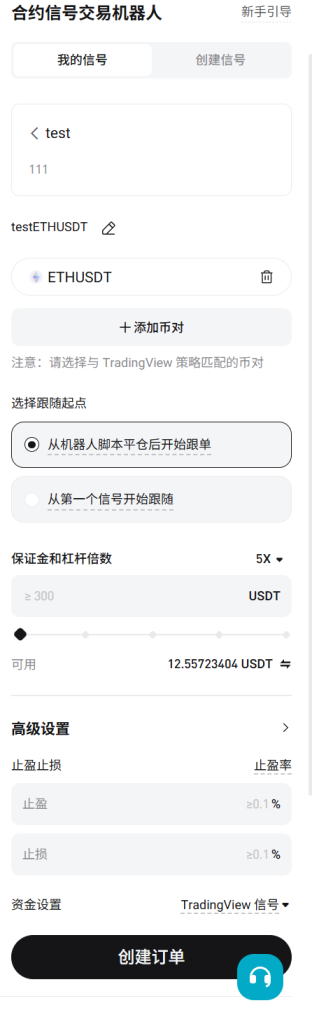 完成后点击创建订单就OK了,同时也要在Bitget里创建信号,创建完成后点击使用,在添加币对中要选择和你警报一样的标的比如在本例中就是ETH USDT.P然后我们选择ETH就可以了然后选择从机器人脚本平仓后开始跟单,同时设置保证金和杠杆以及止盈止损,还有资金设置,建议资金设置改为固定的比例,例如50%。